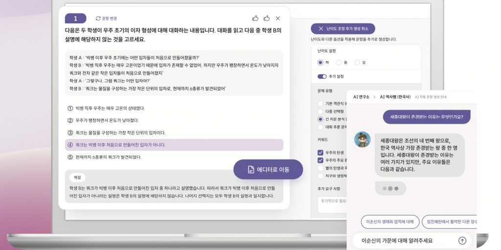 그 시작으로서 과학 문항생성과 역사 Al선생님이 퀘스트북을 통해 공개되었는데요. 국내 교육과정에 적합하게 개발되어 현장에서 바로 사용가능합니다. 게다가 생성된 문항은 퀴즈 저작도구에서 바로 가져와 편집할 수 있어요.