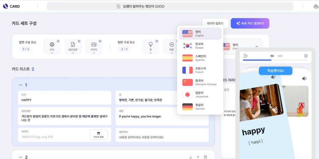새로 추가되는 카드 저작도구는 어학 학습에 효과적인 암기카드를 AI를 통해 손쉽게 만들 수 있습니다. 수백개의 단어도 3초면 만들 수 있게 되었는데요. 생성형AI기술로 영어뿐만 아니라 전 세계의 언어를 단어만 지정하면 발음, 예문, 해석까지 단어장으로 생성할 수 있어요.