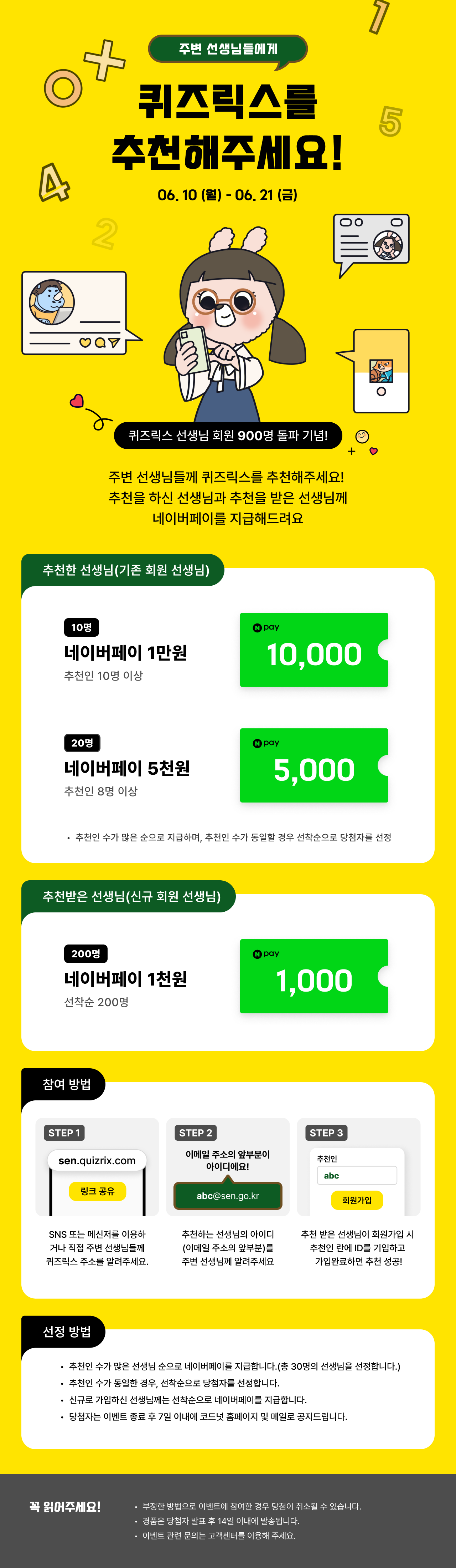 이번 6월, 주변 동료 선생님들에게 퀴즈릭스를 추천하고, 네이버페이도 받아 가세요~ !