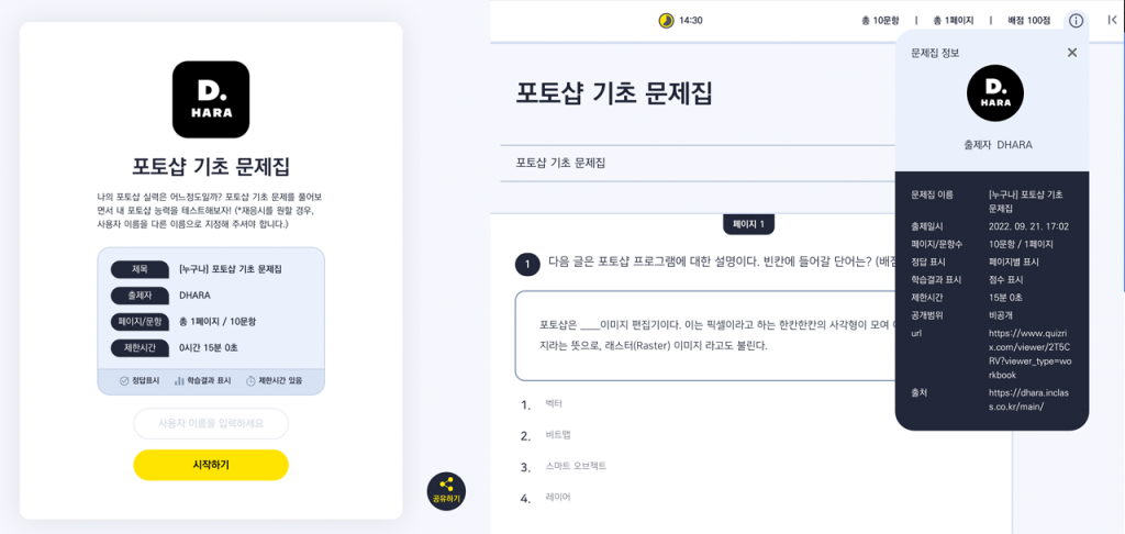 퀴즈릭스의 문제집 저작도구와 콘텐츠 관리기술을 기업이나 기관에 도입하고 싶다는 의견들이 많으셨는데요. 사실 퀴즈릭스 초기 개발부터 개인뿐만 아니라 기업을 위한 서비스를 준비하고 있었습니다. 이번에 디자인 전문 강의사이트 D.HARA와 함께 클라우드 문제집 아카이브를 공동으로 개발하고 공개하였습니다.