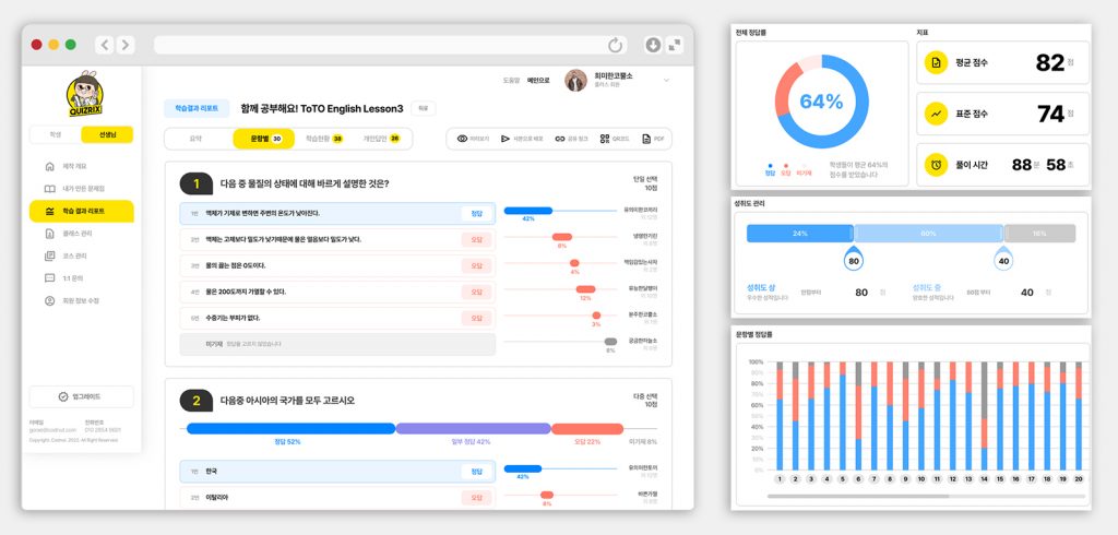현재의 베타테스트에서는 배포된 문제집에 한해서만 학습결과를 표시했었는데요. 이제 “출판”된 모든 문제집은 학습결과 및 통계리포트를 확인하실 수 있습니다. 더불어 더 많은 통계 옵션과 정보를 담을 수 있도록 전체적으로 재설계하였습니다. 정답률과 응시율뿐 아니라 문항별로 좀 더 상세한 정보를 제공하고 유형별로 한 눈에 확인 가능하도록 하였습니다. 이제 선생님은 빠르게 학습결과를 확인하고 학습지도에 활용하실 수 있습니다.